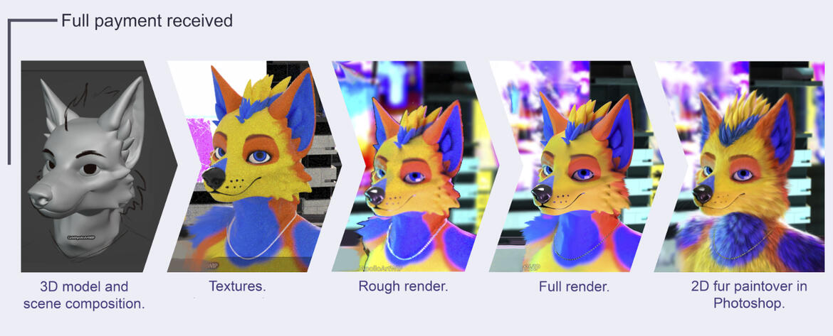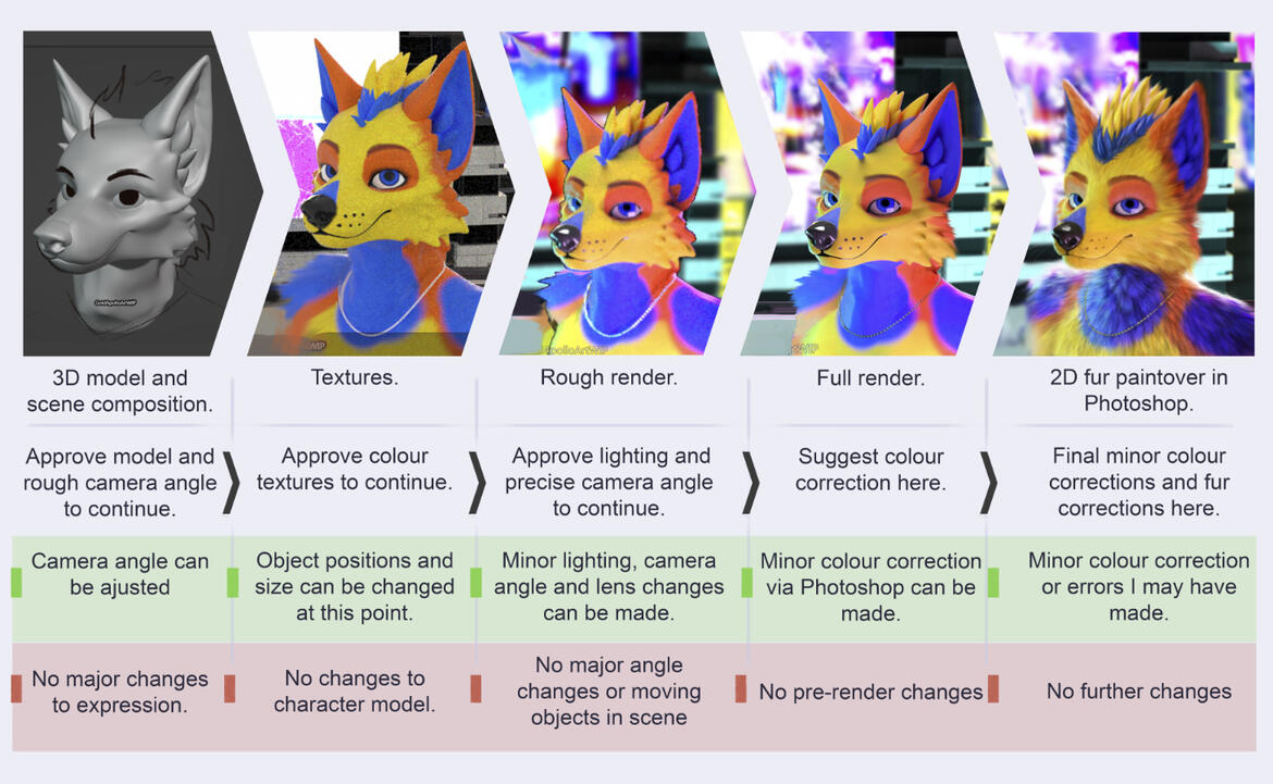 ↪You are welcome to send me imagery and references but no specific photobash or moodboard will be created until a first payment is received.WIPs can be requested at any point during the commission and specific WIPs will be sent to you for approval before moving onto the next stage. (information about stages is outlined in the image below)